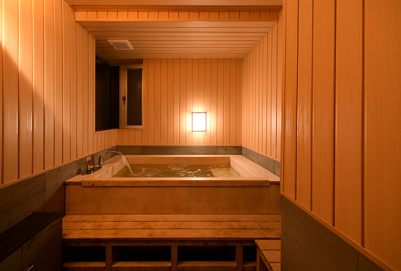 内湯は、露天風呂がしつらえられ、リラックスできる空間となっております。季節の風香る上質なお湯「香住温泉」でゆったりと癒されます。内風呂以外にも露天風呂と一人用の陶器風呂もございます。